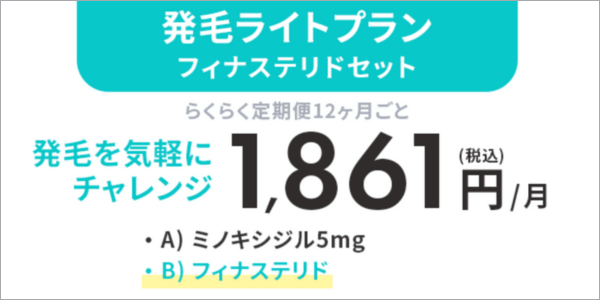 - ※発毛ライトプラン フィナステリドセット らくらく定期便12ヶ月ごとを選択した場合に適用。総額22332円(別途送料550円)