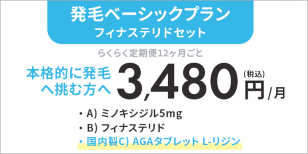 - ※発毛ベーシックプラン フィナステリドセット らくらく定期便12ヶ月ごとを選択した場合に適用。総額41,765円(別途送料550円)