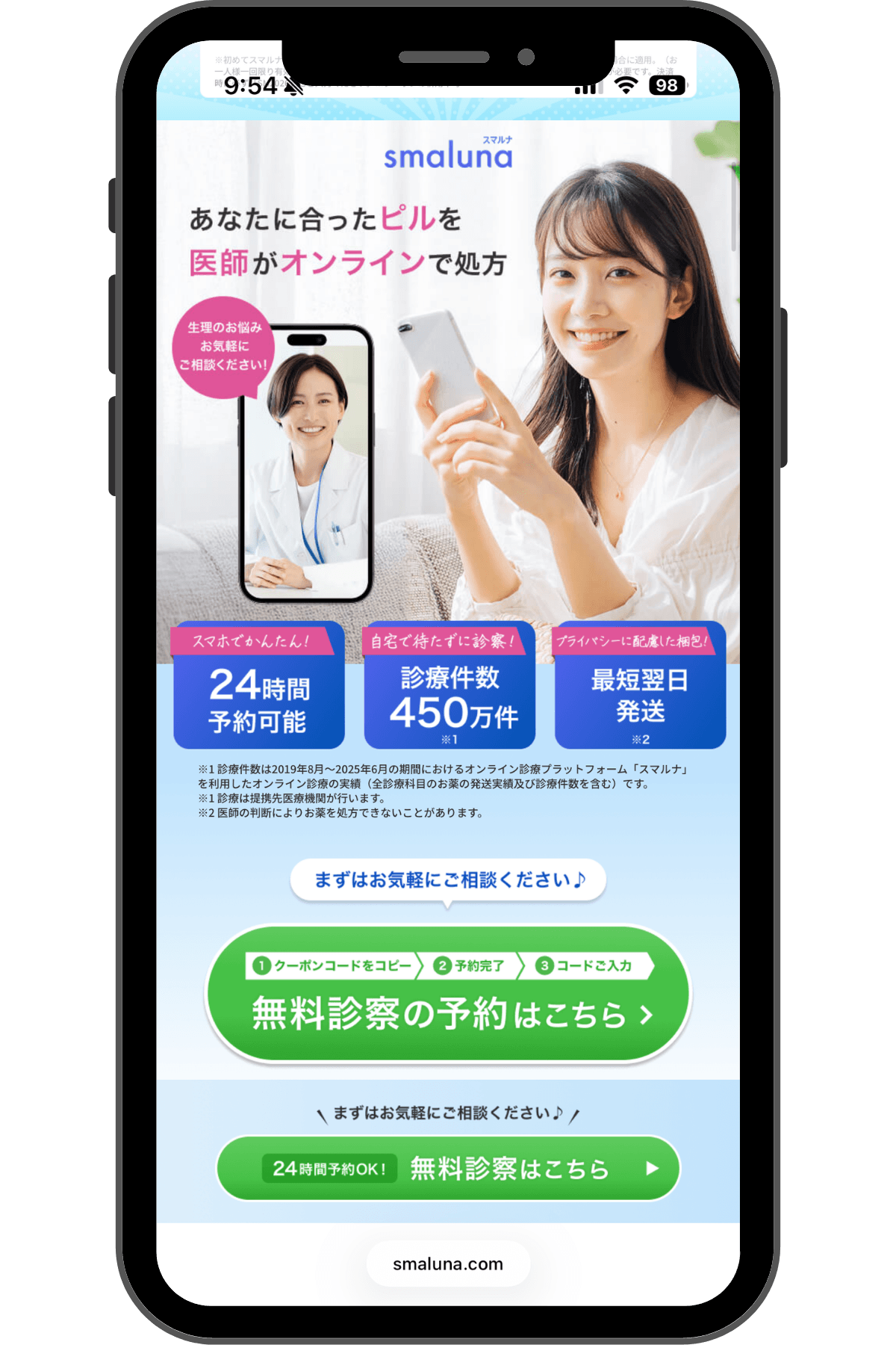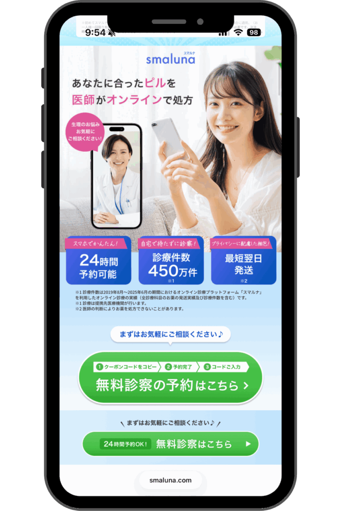 スマルナは、1人1回まで使用できる初回限定クーポンを適用すれば1シートあたり1,480円になる低用量ピルの手頃なプランがおすすめで、予算が限られている人でも利用しやすいオンラインピルクリニックサービスです。