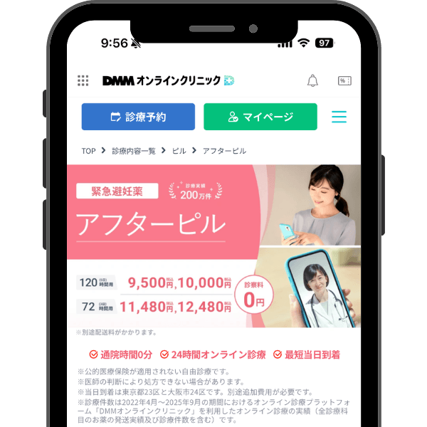 120時間アフターピルの値段は9,500円で安いプランを比較したい人は、DMMオンラインクリニックとの相性が良いです。