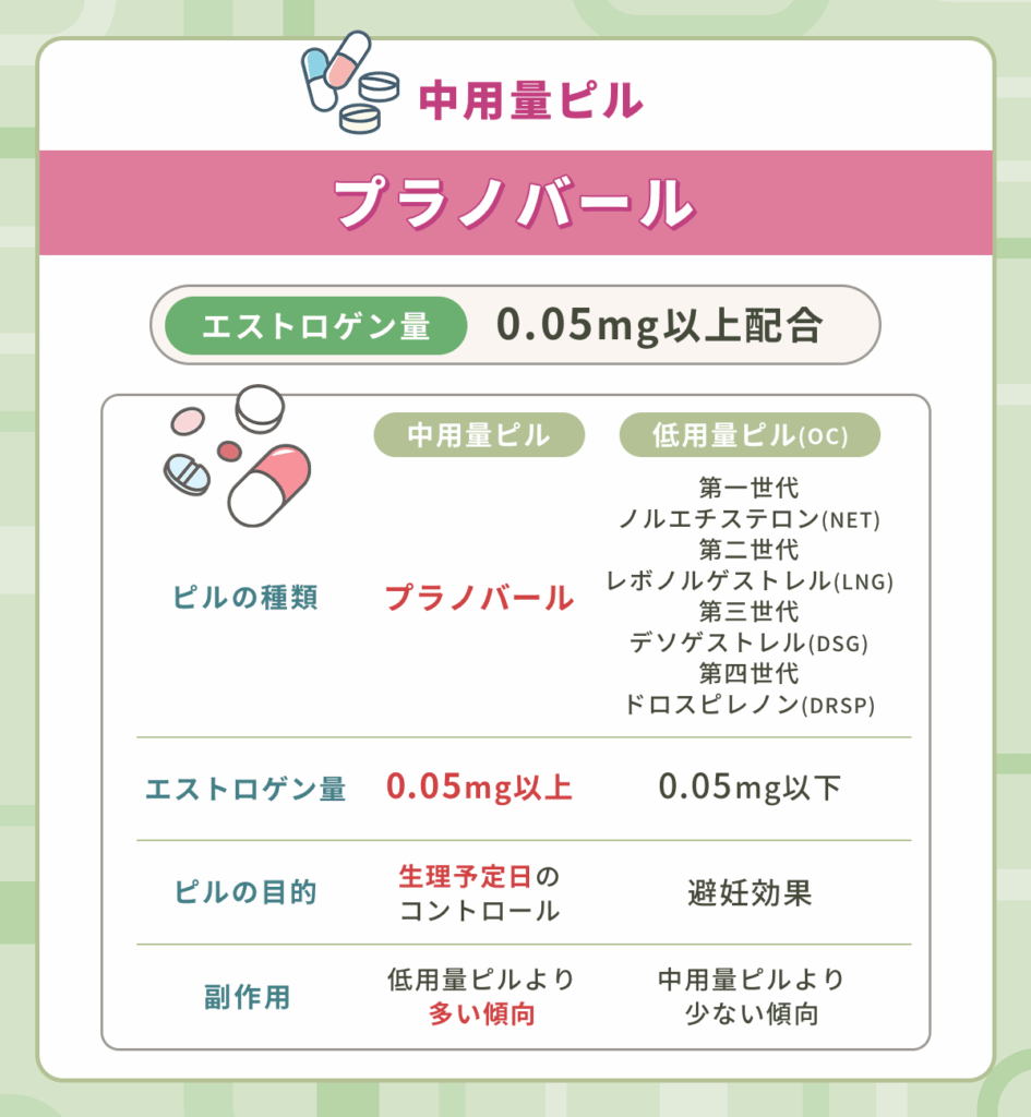 プラノバールは、卵胞ホルモンと黄体ホルモンを配合した「中用量ピル」の種類です。
